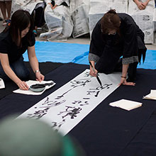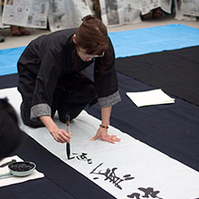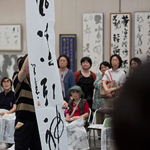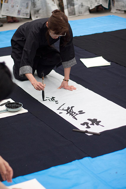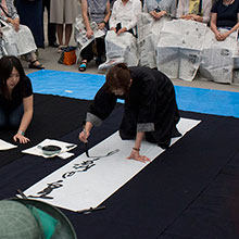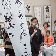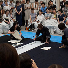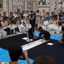 『風清引神』・『夏雨染成千樹緑 暮風散作一江煙 』・『松涛忽巻三更雨 林籟俄驚六月秋』の3点を淡いブルーの単箋に青墨・羊毛の中峰で、連綿・単体と涼やかに筆を運ばれる姿に会場全体が感動しました。