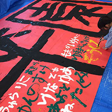 大人でも両手で持たないと重い筆で、今までお世話になった保育園を旅立つんだよ、小学生になるんだよ、みんなで一つの作品を心を一つにして作ろうという気持ちで取り組みました。